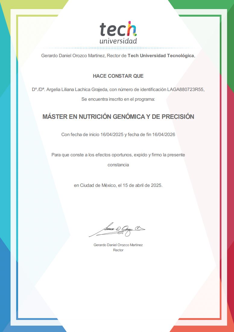 - Cursando Maestría de Nutrición Genómica y de Presición, Tech Institute España